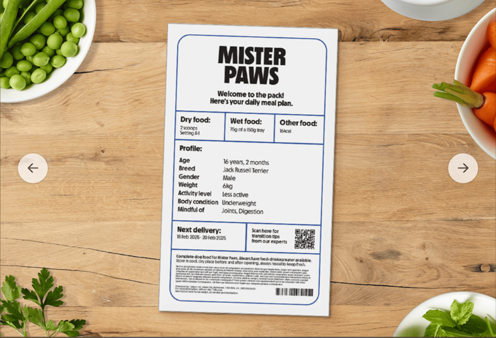 When you told us you’d be feeding wet food, we automatically adjusted the amount of kibble your dog gets. The daily portion on their meal plan is the precise amount of kibble they need to complement their wet food, making sure they get the perfect balance of nutrients, calories, and flavour.