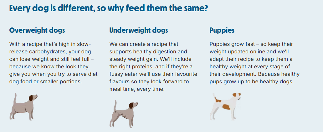 We’ll create a unique recipe of food that has the right balance of calories and other key ingredients in order to help your dog hit their ideal weight. We'll also recommend a portion to help keep your dog at a healthy weight. And our adjustable portion scoop makes it easy to serve up the right amount of food every time.