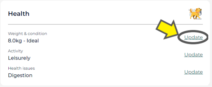2. Under the 'Health' section, choose ‘Update’ next to 'Weight & condition'