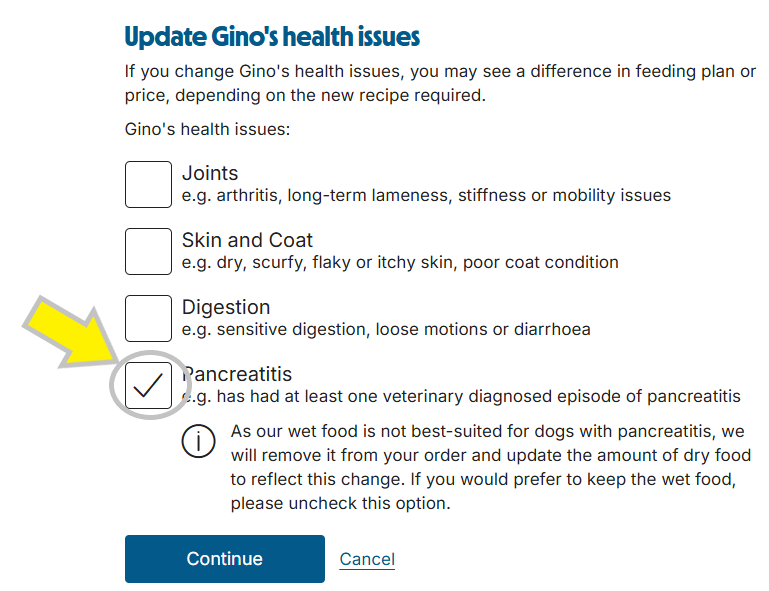 As shown above, please be aware that we wouldn’t recommend our wet food for dogs with pancreatitis, so if your dog is currently eating our wet food, we recommend that you remove this from your ongoing orders and either just feed dry food or find an alternative wet food elsewhere.