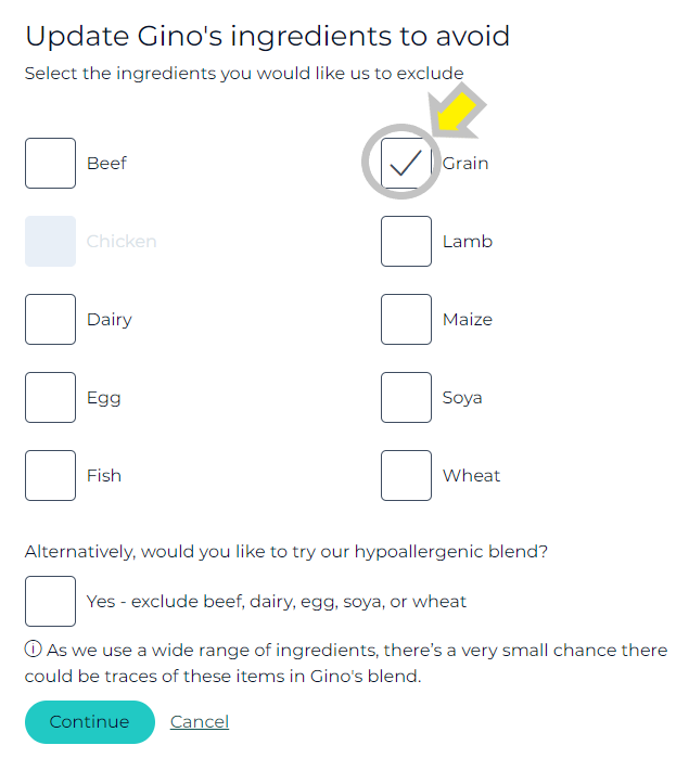 3. Select 'Grain' as an ingredient that you'd like to exclude, by selecting the square box, followed by 'Continue'.