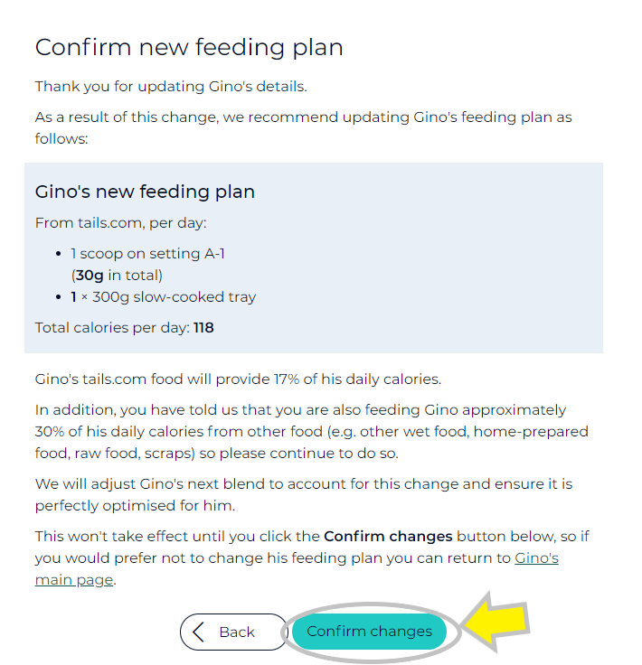 4. You'll then need to confirm your new feeding plan. Any changes you make may affect the price of your ongoing deliveries, but we’ll always tell you this before confirming the changes. Just select 'Confirm changes' if you're happy with your dog's new plan