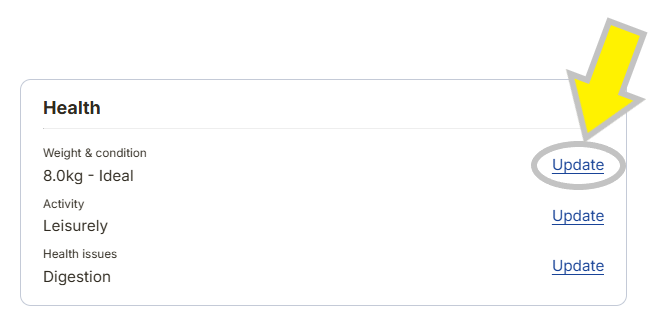 2. Under the 'Health' section, choose ‘Update’ next to 'Weight & condition'