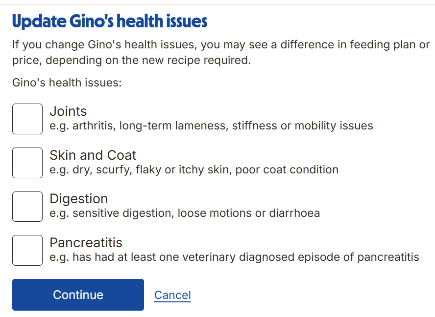 3. Here you can add several health conditions - we can adjust your dog's recipe to help with their joints, skin and coat, digestion and also pancreatitis.
